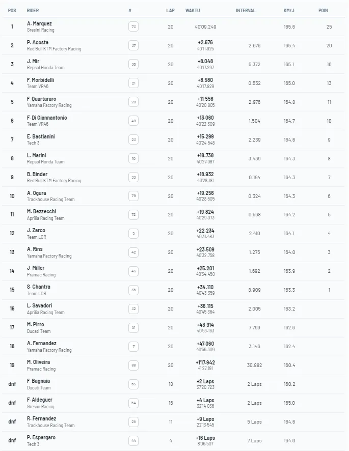 Kemenangan ini menegaskan dominasi Alex Marquez di akhir musim dan menandai pencapaian penting bagi Gresini Racing sebagai tim independen terbaik musim ini.